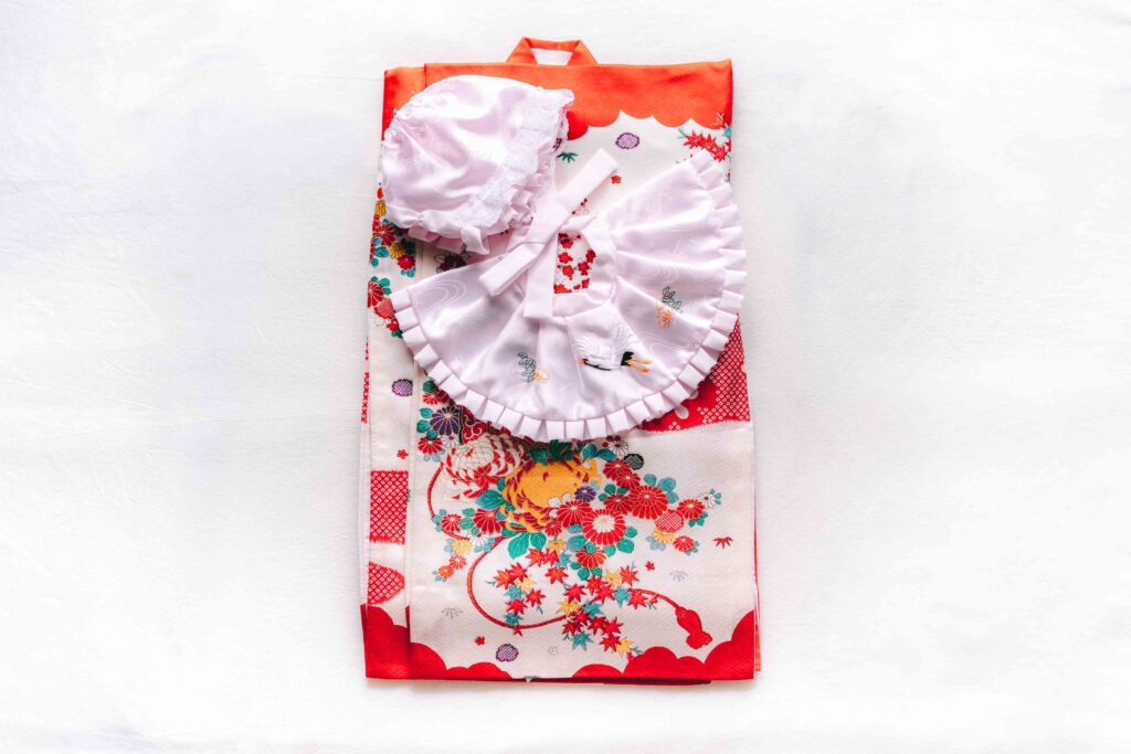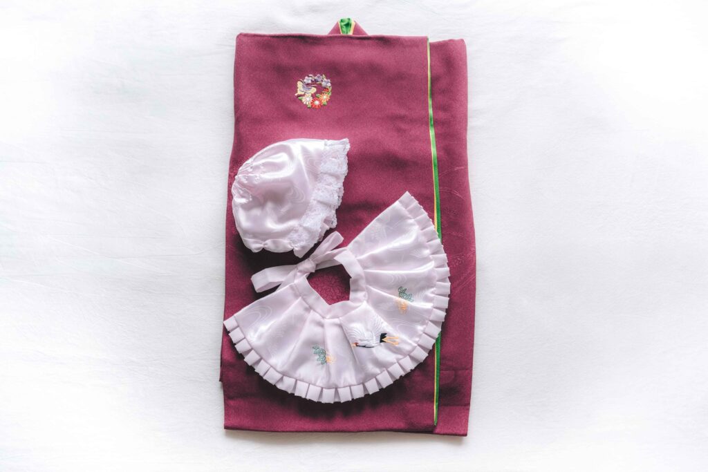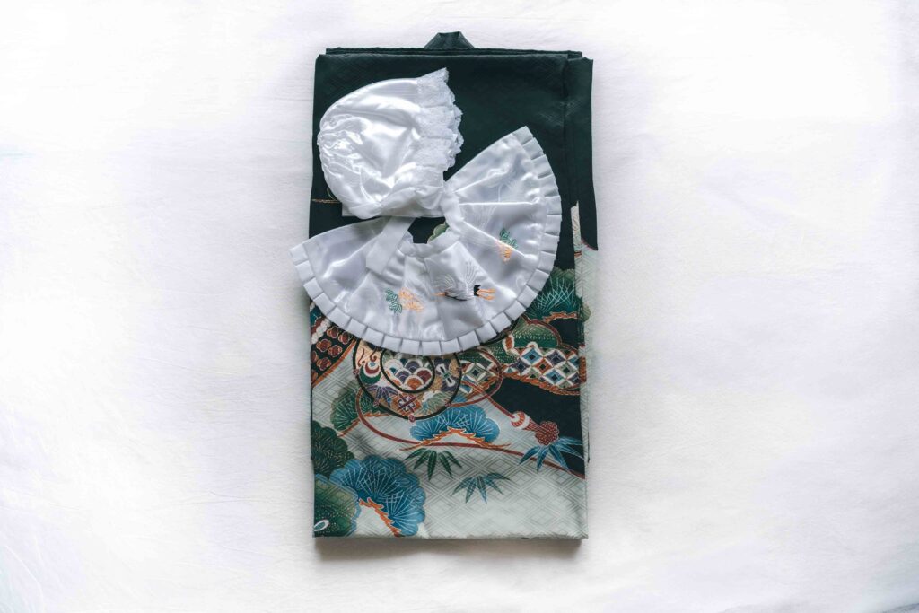 赤ちゃんの祝い着、長襦袢、帽子、よだれかけをセットにしました