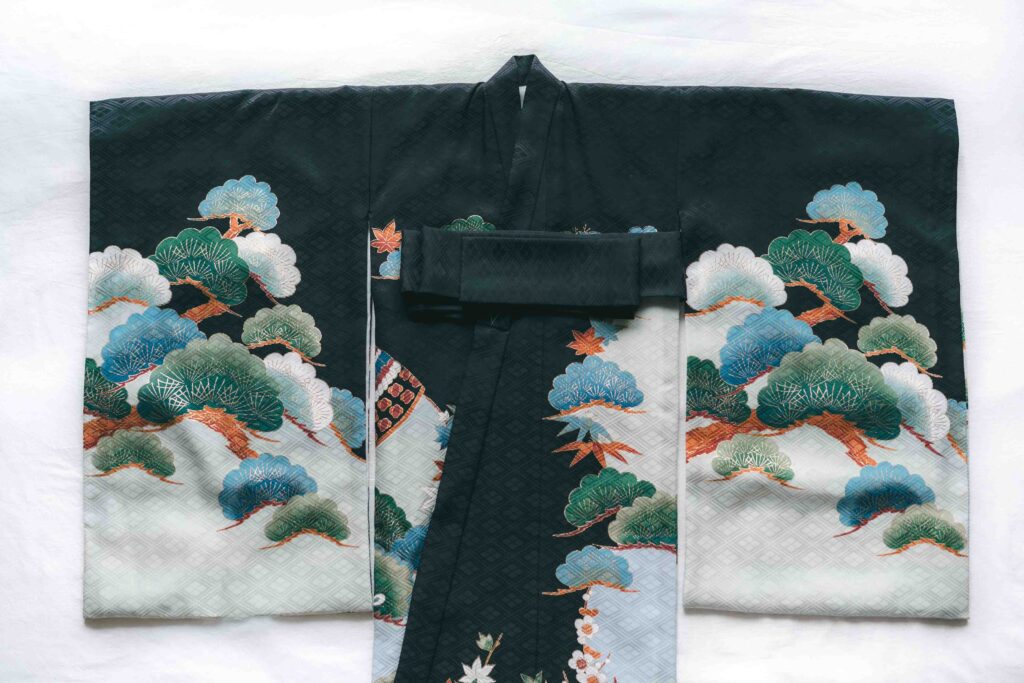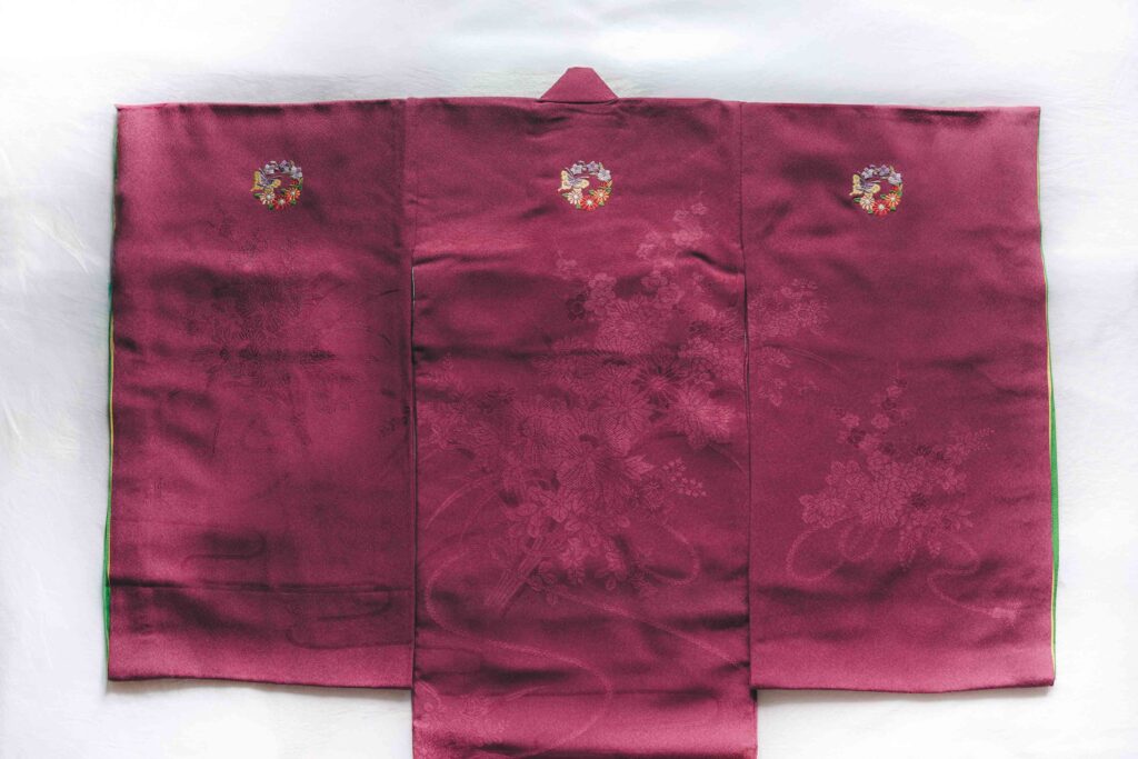 控えめで上品な色合いと、やさしい印象の花刺繍紋が特徴の祝い着です。