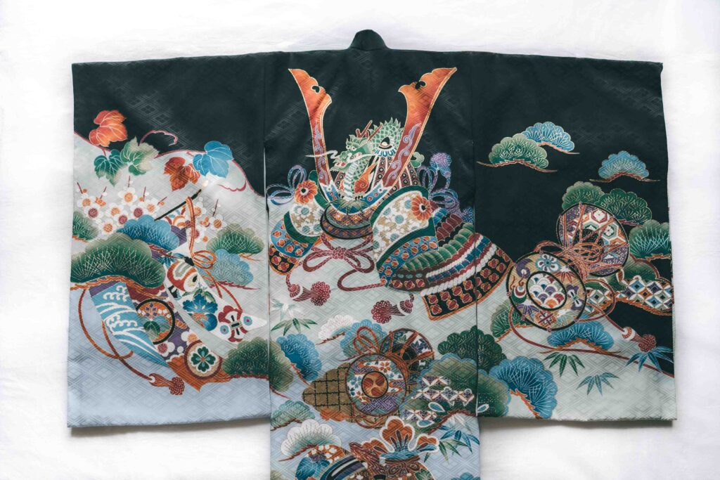 兜や龍などの柄があしらわれた、力強さを感じる祝い着です。