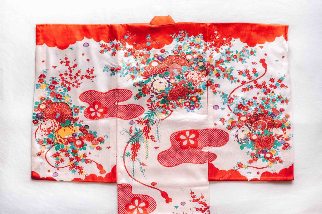 明るく華やかな色合いと可愛らしい柄が特徴の祝い着です。